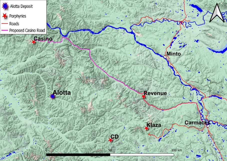 Located in the Dawson Range gold belt in Yukon, Canada, the Alotta Project sits approximately 40 km from Western Copper and Gold’s Casino deposit, one of the largest undeveloped gold-copper deposits globally